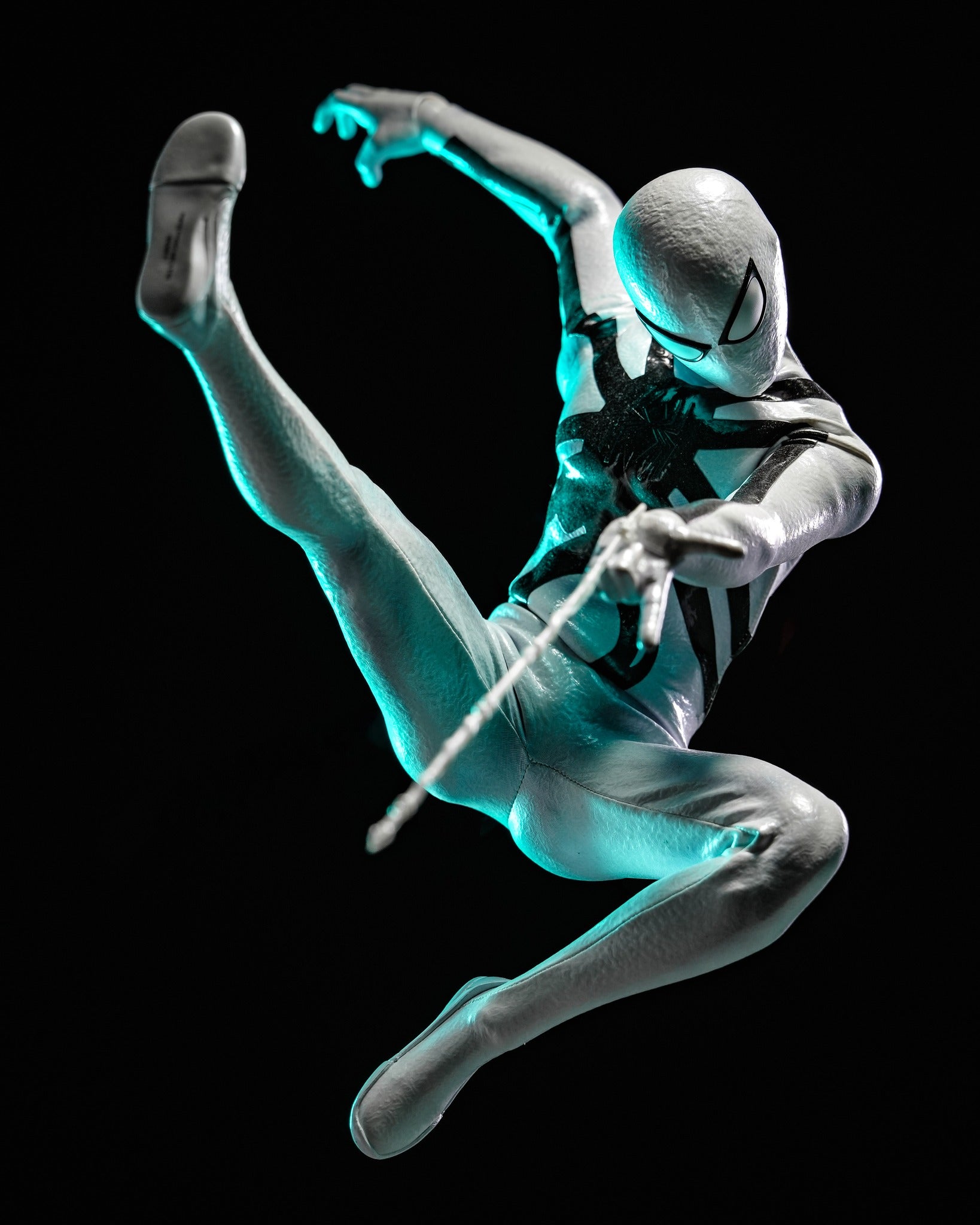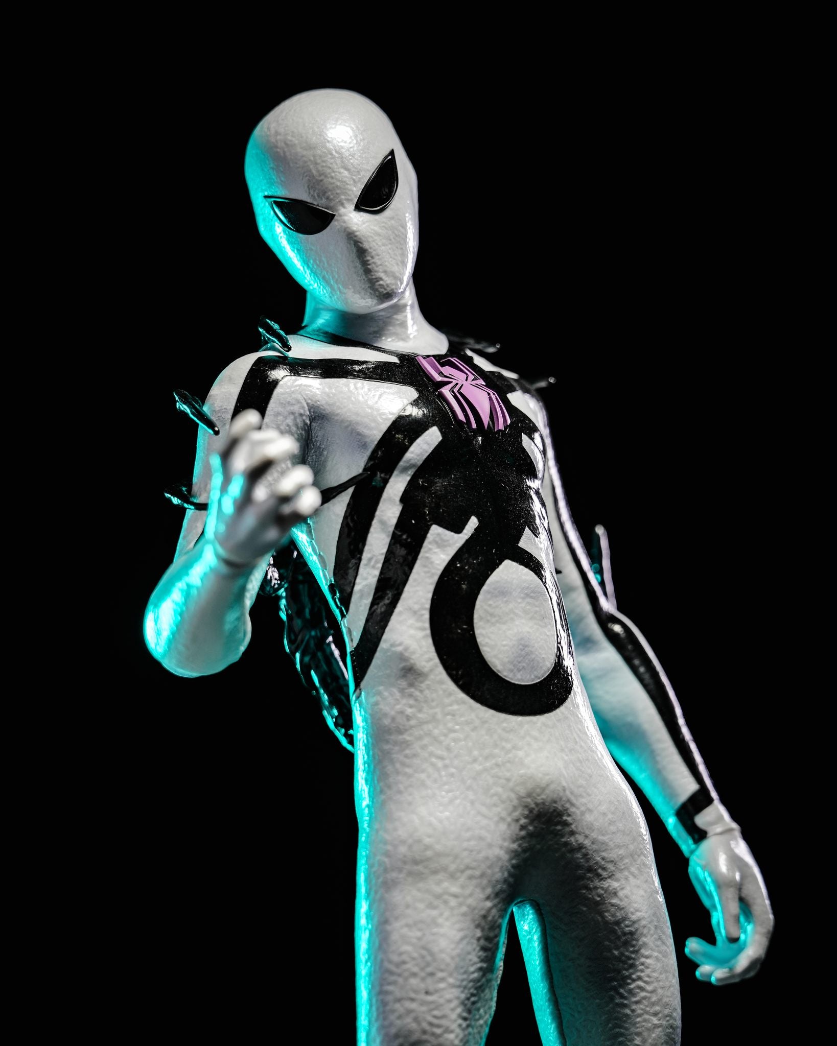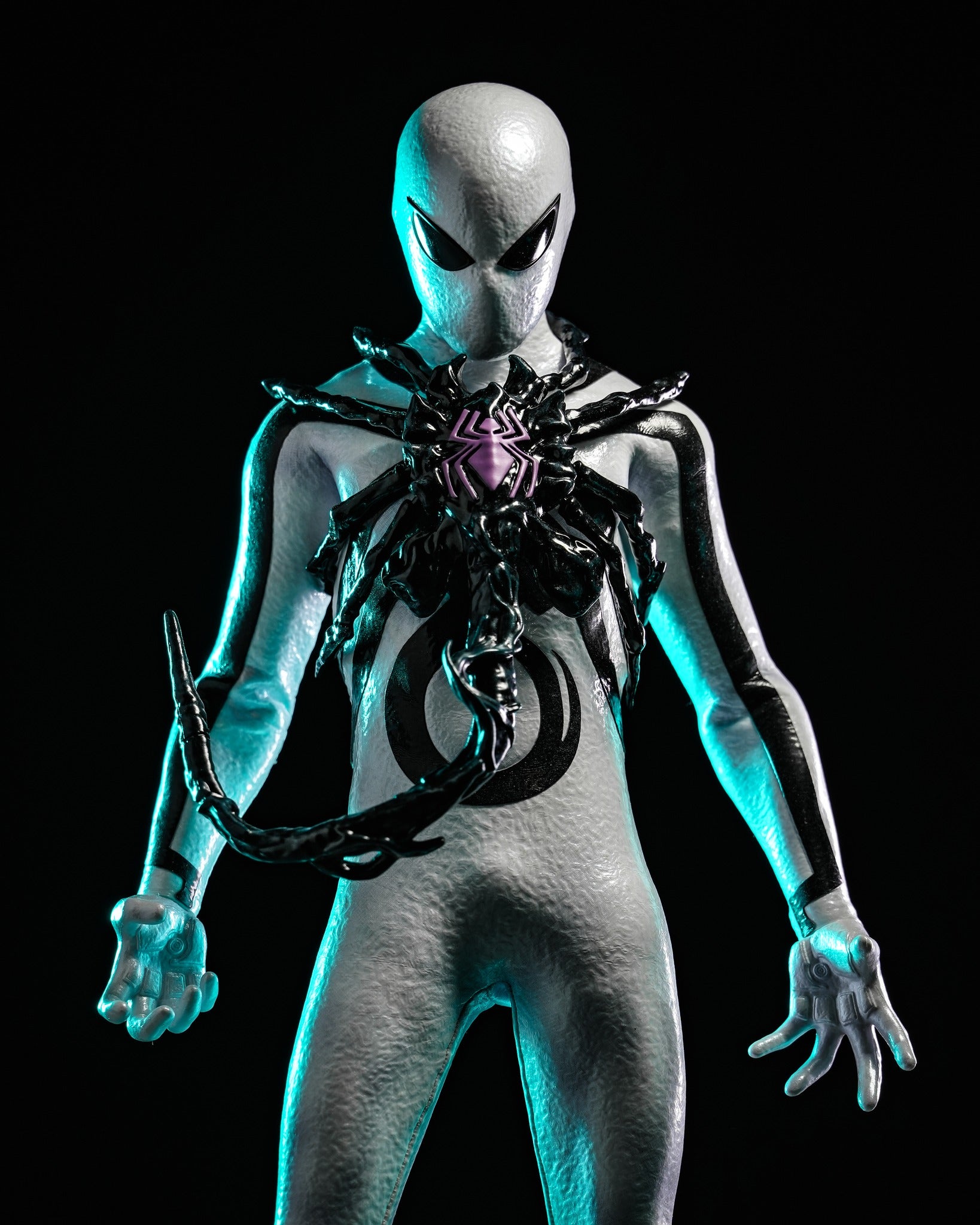 Accessories: - Six (6) strings of spider web in different shapes and lengths (attachable to web-shooting and web-holding hands) - One (1) dark pink colored Spider emblem (magnetically attachable to chest) - One (1) symbiote-bonded Facehugger with Spider-Man emblem (bendable wire embedded) - Specially designed diorama figure base with Xenomorph remains diorama accessories, comic logo, and character nameplate