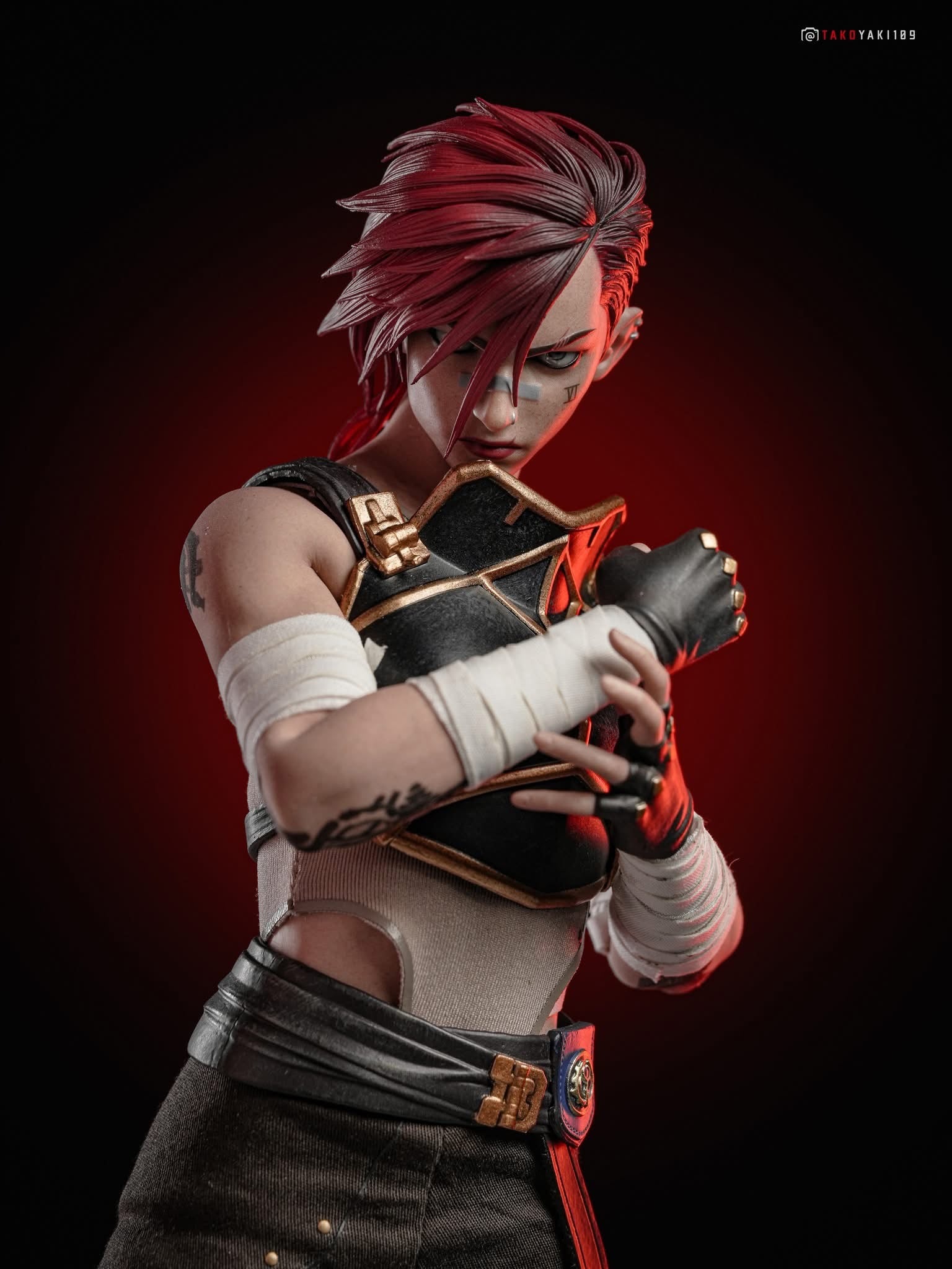 The 1/6th scale Vi Collectible Figure specially features: - Authentic and detailed likeness of Vi in the final episode of Arcane: League of Legends - One (1) newly developed Vi head sculpt with separate rolling eyeballs - Highly-accurate facial expression, makeup and skin texture - Detailed magenta and black undercut hair sculpture - Approximately 28cm tall - Newly developed body with over 28 points of articulations - Seamless design from neck to arms in silicone material, displaying detailed muscle outline - Mechanic tattoo printed on upper back - Four (4) pieces of interchangeable hands including: - One (1) pair of open hands - One (1) pair of fists - Each piece of head sculpt is specially hand-painted