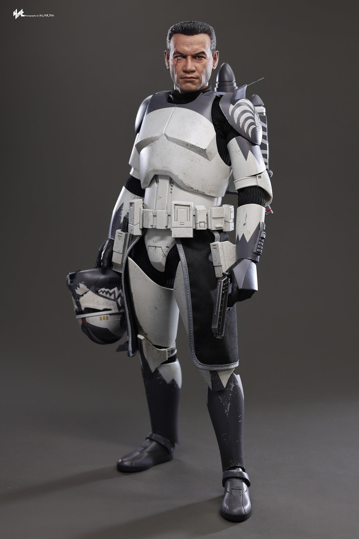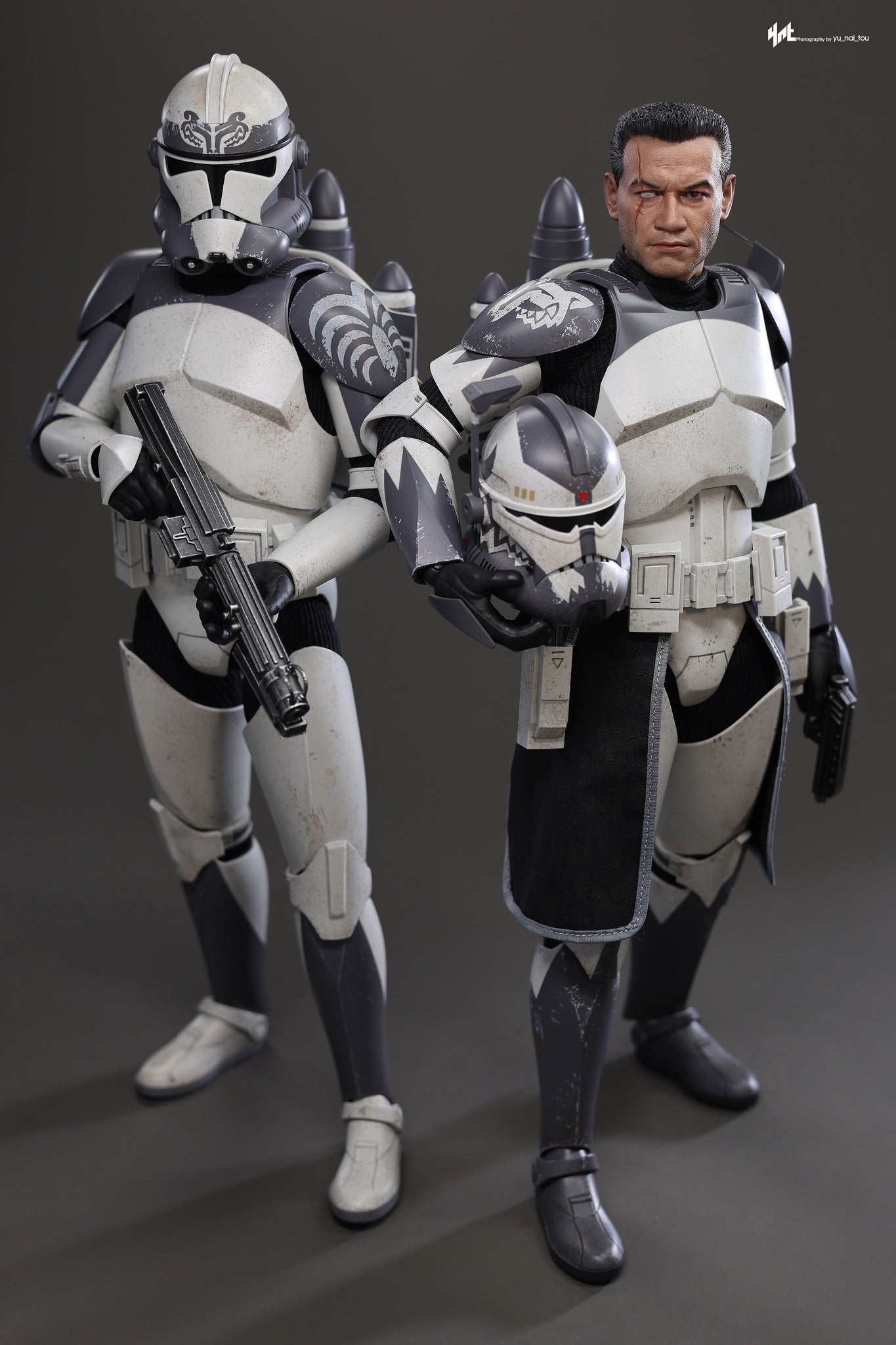The 1/6th scale Clone Commander Wolffe™ Collectible Figure specially features: - Authentic and detailed likeness of Clone Commander Wolffe in Star Wars: The Clone Wars - One (1) newly developed head sculpt with highly-accurate facial expression, white right eye with scar, separate rolling left eyeball and detailed skin texture - Clone Commander Wolffe helmet with weathering effect (Phase 2) - Clone Commander Wolffe helmet with weathering effect (Phase 1) - Armor painted in gray and white color with weathering effects - Specially applied distress effects on armor, weapons and accessories - Approximately 30 cm tall - Body with over 30 points of articulations - Seven (7) pieces of interchangeable gloved hands including: - One (1) pair of relaxed hands - One (1) pair of gun holding hands - One (1) pair of gesture hands - One (1) opened right hand - Each piece of head sculpt is specially hand-painted