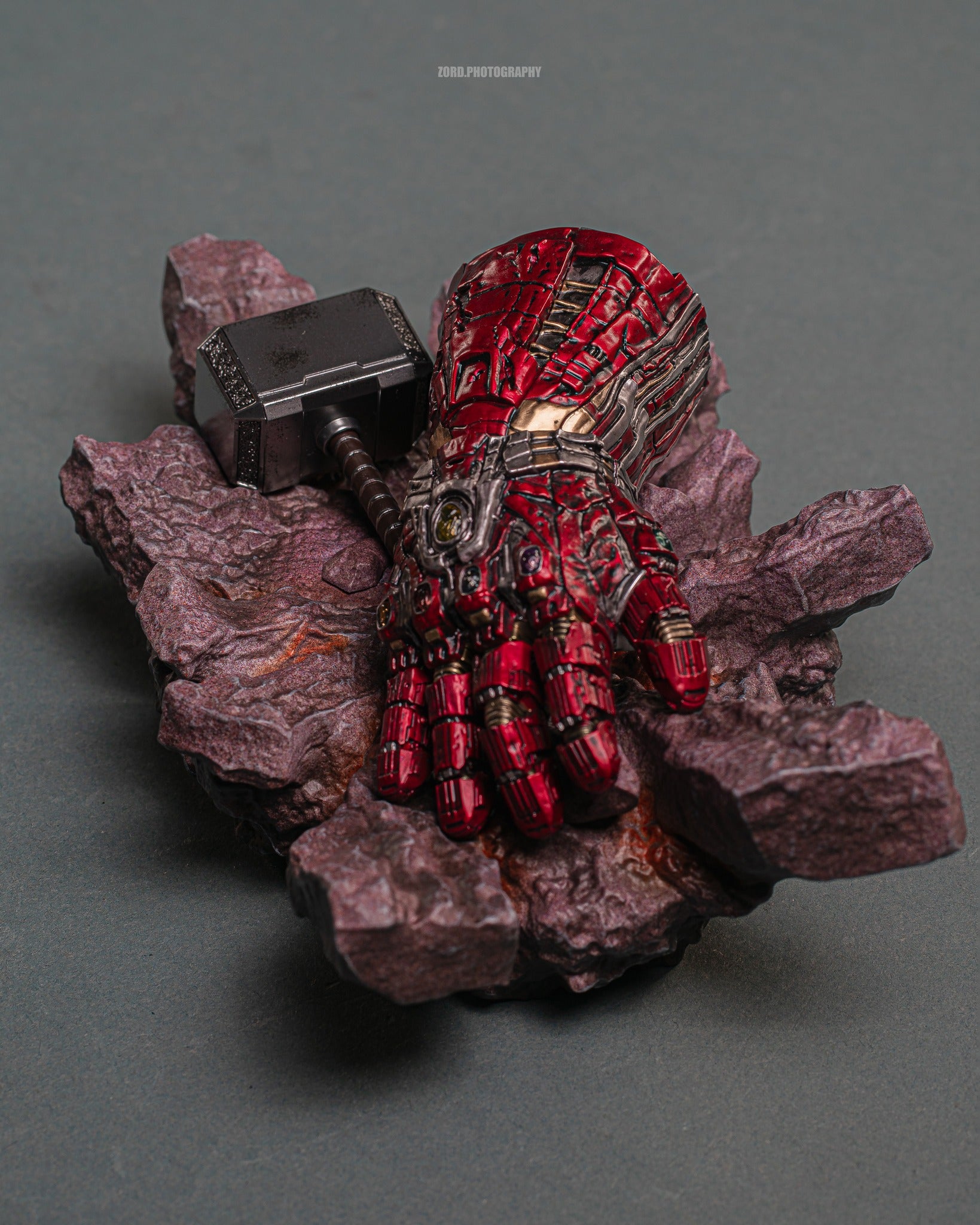 - One (1) damaged Nano Gauntlet and one (1) matching hand with articulated fingers, mounted with six Infinity Stones (6 LED light-up points, battery operated)