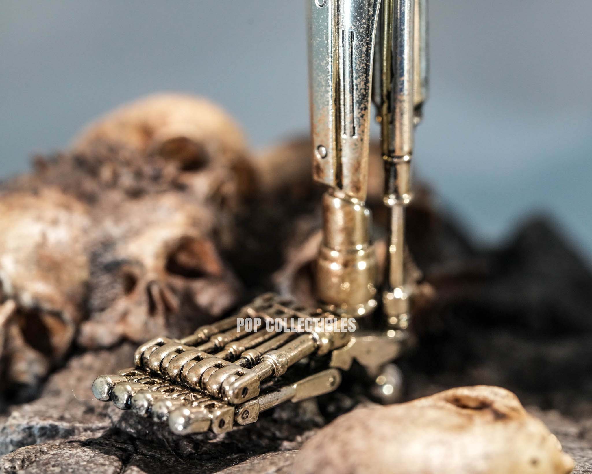 Accessories include two new plasma rifles, multiple interchangeable hands, and a themed display base inspired by the post-Judgment Day wasteland, complete with human skulls stacked among rubble—instantly recreating the chilling opening battlefield scene.