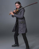 - One (1) meticulously tailored dark gray coat with button details